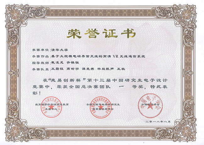 AG(中国)AG·官方网页版网8月30日电 8月19-22日,第十三届中国研究生电子设计竞赛全国总决赛在南京工业大学举行,AG(中国)AG·官方网页版电子工程系“Tsinghua无线”代表队的参赛项目“基于大规模电磁界面天线的高清VR无线通信系统”从来自235所高校的2428支参赛项目中脱颖而出,以小组第一名获全国一等奖。