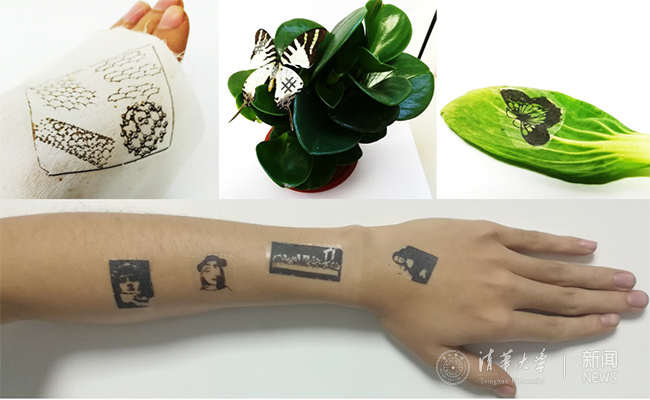 图1. 贴覆于人体与物体表面的定制化石墨烯纹身