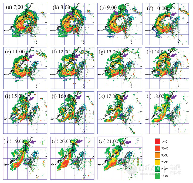 根据多普勒雷达观测表明,此次降水过程主要是由一条长生命周期(>13小时)的台风雨带控制(如图),雨带过境还伴随着气压升高、气温下降和风向风速剧变等一系列扰动。通过傅立叶波形分解,研究者发现雨带主要跟一波数为二的扰动相关,且该扰动的动力性质符合涡旋罗斯贝波特征,如径向缓慢向外传播、切向则以低于环境流场的波速气旋式传播。数值模拟实验也表明该雨带与涡旋罗斯贝波相关。同时,还表明雨带之所以沿海岸线移动还受到地形抬升及摩擦造成的沿岸地区的强水汽辐合的影响。