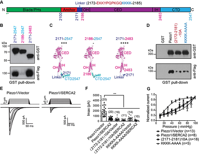 A. Piezo1与SERCA2结合位点连接区的氨基酸组成和所在位置示意图;B, C, D. SERCA2通过Piezo1的连接区与Piezo1相互作用;E. SERCA2抑制Piezo1的通道活性;F, G. SERCA2通过Piezo1的连接区抑制Piezo1的机械敏感性。
