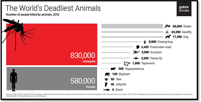图1. 世界上最致命的动物 (盖茨基金会, 2016)。