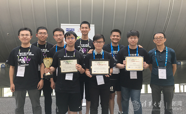 荣获国际超算竞赛总冠军的清华学生超算团队。(左起:叶方柯、谢磊、冯冠宇、李北辰、刘家昌、王邈、李宇轩。左一为指导教师韩文弢,右一为杨广文教授)