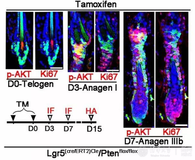 皮肤干细胞具有再生毛囊等表皮附属器官的潜力,然而它们受损而失去时却往往不能被再生。因此,人们关注皮肤受到损伤时皮肤干细胞是如何反应的。本研究揭示,皮肤损伤时巨噬细胞分泌一种称为TNF的因子,它通过介导Akt/β链蛋白信号,激活Lgr5+毛囊干细胞;人为激活Akt/(β链蛋白)信号能够促进毛囊再生。本研究为研究促进毛囊和皮肤再生的方法奠定了基础。
