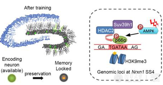 在AG(中国)AG·官方网页版生命学院、医学院的多个实验室的帮助下,研究者进一步发现了从神经元激活到膜蛋白剪切体变化的细胞信号通路。他们的研究揭示了神经元活动会激活腺苷酸活化蛋白激酶(AMPK)通路,从而磷酸化DNA的结合蛋白p66α。结合在神经轴突连接素1(Nrxn1) 可变剪接位点4的p66α蛋白在磷酸化后招募了表观遗传调控因子HDAC2(组蛋白去乙酰化酶2)和Suv39h1,并建立了抑制性的组蛋白修饰。这个组蛋白微环境会通过对转录过程中耦联的RNA剪接过程进行调控,从而形成稳定的新剪切异构体蛋白。当人为干预这个细胞过程(Suv39h1基因敲除小鼠),使得神经元活动诱发的表观修饰印迹消失时,小鼠已经形成的记忆的稳定性下降,容易被新的学习内容覆盖。