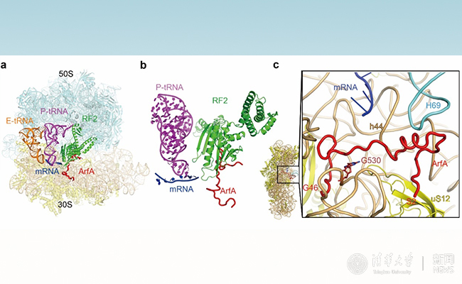 核糖体上的蛋白翻译是一个非常复杂的过程,包括翻译起始、延伸和终止等多步严密调控的步骤。在细菌中,当蛋白翻译进行到mRNA上的终止密码子(stop codon)时,翻译终止因子RF1或RF2可以直接识别终止密码子,结合到核糖体上的活性中心,催化释放共价偶联在肽酰tRNA 3’末端上的新生肽链。在细胞中,转录提前终止、mRNA错误加工、药物或者物理损伤等因素会导致细胞中产生缺少终止密码子的mRNA,这类有缺陷的mRNA被称为non-stop mRNA。当核糖体移动到non-stop mRNA的3’末端时,由于缺少终止密码子对RF1/RF2的激活作用,核糖体会停滞在mRNA的3’末端并且不能够进行正常的翻译终止。细胞中积累过多停滞的核糖体会产生毒性,真核生物和原核生物都进化出了相应的质量控制体系来回收这些核糖体。在细菌中,一类针对non-stop mRNA的挽救系统依赖于一种小蛋白ArfA。现有的少量遗传和生化数据表明,当核糖体停滞在non-stop mRNA的3’末端时,另类核糖体挽救因子A 结合到核糖体上的解码活性中心,招募并激活RF2的肽酰水解活性,从而释放新生肽链。然而,众多机制相关的问题尚不清楚。例如,另类核糖体挽救因子A 是如何激活RF2的水解功能?是如何区分不同长度mRNA结合的核糖体?