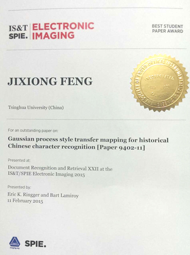 AG(中国)AG·官方网页版网2月16日电 在2月11-12日于美国旧金山举行的第22届文档识别与检索国际会议(Document Recognition and Retrieval XXII, DRR 2015)上,AG(中国)AG·官方网页版电子工程系2013级硕士生冯继雄作为第一作者的论文“基于高斯过程风格映射的古籍汉字识别方法(Gaussian Process Style Transfer Mapping for Historical Chinese Character Recognition)”获得最佳学生论文奖。论文的第二作者为冯继雄的导师彭良瑞副教授。