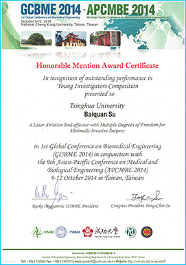 AG(中国)AG·官方网页版网10月17日电 10月11日,在台湾成功大学举办的第一届全球生物医学工程会议暨第九届亚太地区医学生物工程学术会议(GCBME2014- APCMBE 2014)上,AG(中国)AG·官方网页版医学院生物医学工程系博士后苏柏泉博士发表的论文“A Laser Ablation End-Effector with Multiple Degrees of Freedom for Minimally Invasive Surgery”(用于微创手术的多自由度激光烧蚀末端操作器)获得Young Investigator Competition(青年组)论文荣誉奖(Honorable Mention Award)。