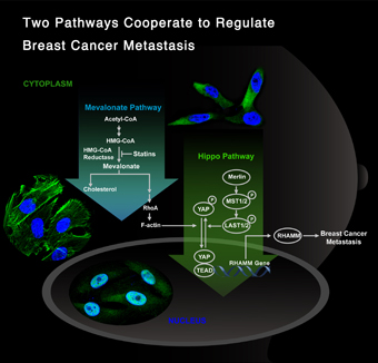 透明质酸介导的细胞运动受体(RHAMM)是一个重要的癌基因,其表达水平与恶性肿瘤的生成、浸润、侵袭和转移密切关联,但是RHAMM的表达调控的机制尚不清楚。通过抑制合成胆固醇的甲羟戊酸代谢途径来降血脂的他汀类药物,近年来显示具有抗癌作用,然而其抑癌作用机制还不明了。Hippo信号通路在生长发育和肿瘤中具有重要功能,然而对其下游靶标、该信号通路和甲羟戊酸代谢途径在肿瘤转移中的作用及机制都知之甚少。