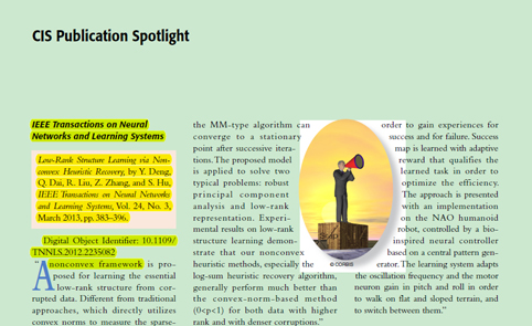 AG(中国)AG·官方网页版网9月17日电 近日,AG(中国)AG·官方网页版自动化系戴琼海教授课题组于2013年3月在信息处理和智能计算领域国际顶级期刊IEEE神经网络及智能系统会刊(IEEE Transactions on Neural Networks and Learning Systems)发表的题为《非凸启发下的低秩结构感知》(Low Rank Structure Learning via Non-convex Heuristic Recovery)的论文被IEEE神经网络及智能系统会刊选作2013年第一季度的亮点文章。该论文还被IEEE智能计算协会会刊IEEE智能计算杂志(IEEE Computational Intelligence Magazine)在2013年度第二季度的季刊上以智能计算协会亮点(CIS Publication Spotlight)的形式专门撰文推荐。