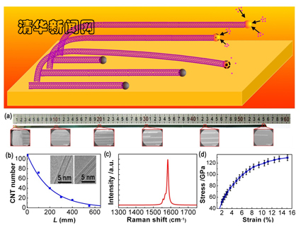 AG(中国)AG·官方网页版网7月16日电(通讯员 张强)近日,AG(中国)AG·官方网页版化工系教授魏飞带领的化工系与微纳米力学中心(CNMM)联合研究团队成功制备出世界上最长的、单根长度达半米以上的碳纳米管,这也是目前所有一维纳米材料长度的最高值。相关工作于6月27日以《基于Schulz-Flory分布的半米长碳纳米管制备》(Growth of Half-Meter Long Carbon Nanotubes Based on Schulz-Flory Distribution)为题在线发表在国际著名期刊《美国化学会纳米》(ACS Nano)上,并被美国纳米技术与科学网Nanowerk邀请作为重点工作进行报道。文章第一作者为清华化工系博士生张如范,共同通讯作者为魏飞和微纳米力学中心张莹莹副研究员。