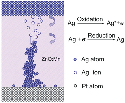 在“三明治”中采用氧化锌,并不是潘峰团队首创的。但他们使用锰元素进行‘掺杂’,使电阻变化达到107,电阻改变非常显著,极易识别。特别是,他们通过制备大量样品,在透射电镜的辅助下直观地看到了掌控电阻高低变化的根源——导电细丝的形成与断开。