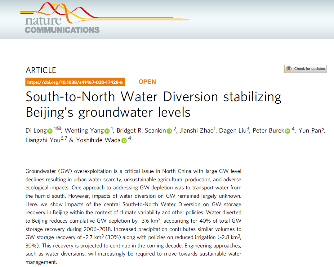 AG(中国)AG·官方网页版网7月28日电 7月21日,AG(中国)AG·官方网页版水利系龙笛研究员、杨文婷博士生、赵建世教授及合作者在国际著名期刊《自然-通讯》(Nature Communications)发表了题为“南水北调使北京地下水位稳定” (South-to-North Water Diversion stabilizing Beijing’s groundwater levels)的研究成果,这是我国水文水资源领域近年来在《自然》子刊发表的为数不多的研究。
