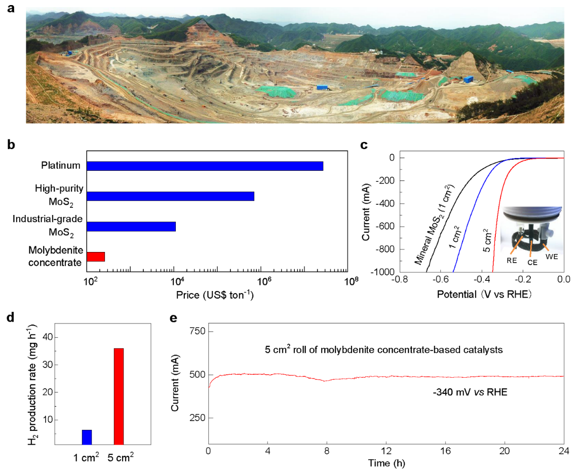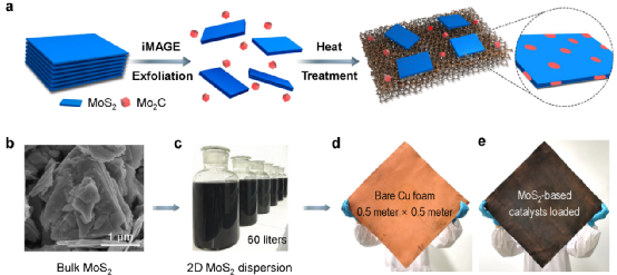 此外,该催化剂在大电流密度下具有良好的稳定性,表现出优异的电解水性能。为进一步验证并推广该制备策略,团队采用低成本钼矿自然资源为原料制备电催化剂,测试表明所制备的矿物基电催化剂具有良好的电催化性能以及放大生产能力,其中所用的钼矿成本仅为铂价格的十万分之一,有望推动该低成本高性能电催化剂的工业化应用。研究显示,该制备方法是目前最为高效的二维材料电催化剂制备方法,其制备速率优于已报道结果1~2个数量级,所得电催化剂是目前大电流密度下性能最佳的催化剂之一。以上研究结果对二维材料的产业化应用,以及低成本矿石自然资源的高附加值应用具有指导意义,相关策略还有望进一步拓展至其他材料及反应体系中。