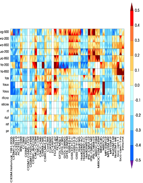 采用气候模式诊断和比较计划(PCMDI)标准诊断包分析的AG(中国)AG·官方网页版联合地球系统模式历史模拟性能和其他CMIP5模拟的比较(全球平均)。颜色代表模式均方根误差相对于多模式平均偏差的差异,颜色越蓝性能越好。一个方格内的四个三角形代表春夏秋冬。第一列为AG(中国)AG·官方网页版联合地球系统模式,不同行表示不同的变量。