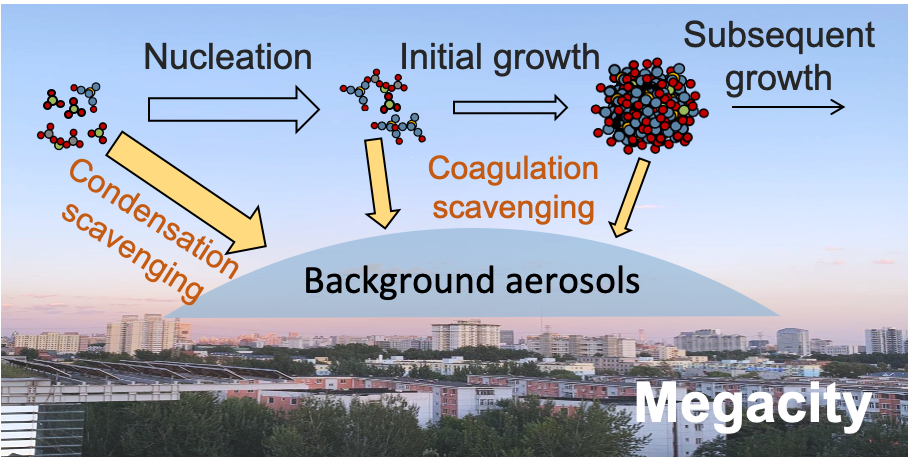 新粒子生成是指大气中气态分子通过均相成核形成高浓度的纳米颗粒物,之后通过冷凝等作用继续增长的过程。增长后的新粒子可作为云凝结核影响全球气候,也有研究报道新粒子生成和增长会影响空气质量。新粒子生成现象普遍存在,从清洁的森林大气环境到污染的城市大气环境,均有新粒子频繁生成现象的报道。在污染的城市大气环境中,背景气溶胶浓度通常较高,使得大气中的气态分子和新生成的纳米颗粒物容易被其去除。尽管存在高浓度背景气溶胶的抑制作用,在污染城市大气环境中仍旧观测到了频繁的高强度新粒子生成现象,揭示其机制及影响因素具有重要意义。