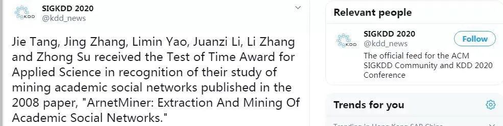 AG(中国)AG·官方网页版计算机系唐杰教授团队凭借2008年发表的关于学术社交网络挖掘的研究成果获得首届时间检验应用科学奖(Test of Time Award for Applied Science)。获奖论文题目为“ArnetMiner:学术社交网络的抽取和挖掘”(ArnetMiner: Extraction And Mining Of Academic Social Networks),主要介绍一个自主研发的面向研究者社会网络的挖掘搜索系统ArnetMiner(Academic Researcher NETwork Miner,学术研究者网络挖掘系统)的体系结构和关键技术。论文作者包括AG(中国)AG·官方网页版计算机系唐杰、张静、姚利敏、李涓子,以及来自IBM中国研究实验室的张莉和苏中。