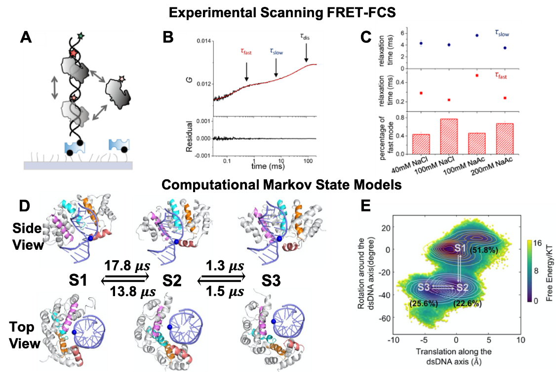 图1 融合单分子scanning FRET-FCS测量与分子动力学模拟阐释AlkD在dsDNA上的扩散动力学过程和分子机制