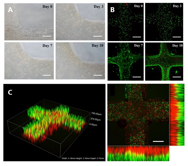 图3 打印后的细胞具有良好的生物学活性 (A)细胞随时间稳定增殖 (B)细胞具有高成活率 (C)胃上皮细胞和胃平滑肌细胞在组织支架中明显分层