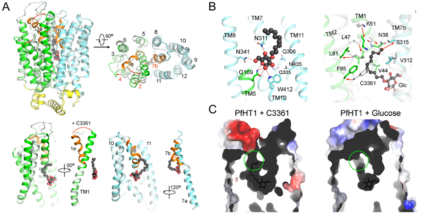 (A)相比与底物葡萄糖结合的PfHT1蛋白构象,与抑制剂C3361的结合引起了PfHT1蛋白巨大的构象变化;(B)C3361分子在占据底物葡萄糖结合位点的同时在其尾部诱导产生了一个新的空腔;(C)葡萄糖/C3361分别与PfHT1结合构象下的空腔对比。