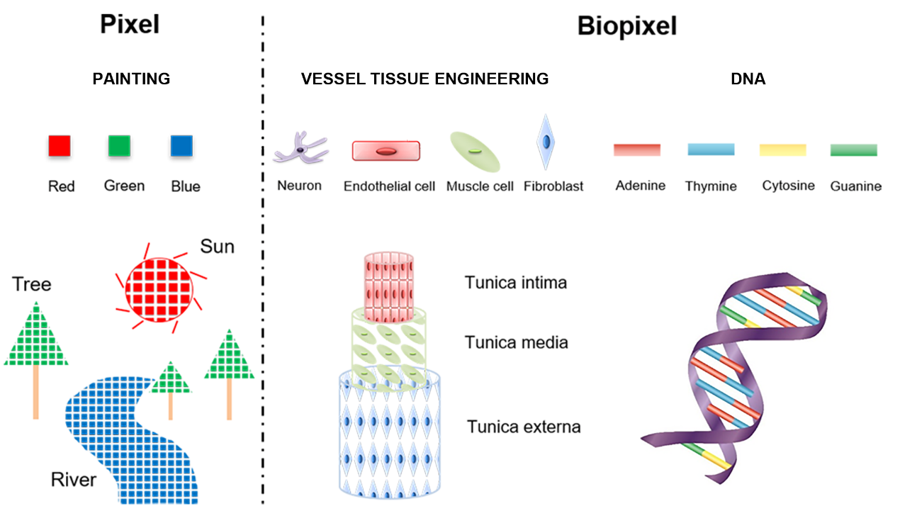 高分辨率是喷墨打印的重要特点, 受彩色印刷像素概念的启发,文章首次提出了生物像素的概念:将人体内四大组织(神经、上皮、肌肉、结缔)来源的祖细胞定义为细胞三维打印的“生物像素”。根据给定位置信息,将“生物像素”按不同数量比例进行打印组装并诱导分化,即可形成不同组织与器官。且单位体积内“生物像素”的含量越高,细胞间联系越充分,协同作用越强,即“分辨率”越高。此外,组成DNA分子的四个碱基(A, T, C, G)可归纳为用于DNA制造的“生物像素”:通过喷墨打印技术将不同的碱基对按照不同的次序排列,即可根据需要定制不同长度和序列的DNA链,以此构建信息存储的生物载体。这一概念的提出,为喷墨打印构建组织与器官提供了一种更本质的阐述,有望更全面地指导活体打印设计、仿生结构成形和生物功能实现;同时亦可为喷墨打印技术在信息存储领域的应用提供指导和参考。该文还展望了面向功能化组织/器官制造的4D喷墨生物打印技术,并描绘了生物3D打印发展路线图。