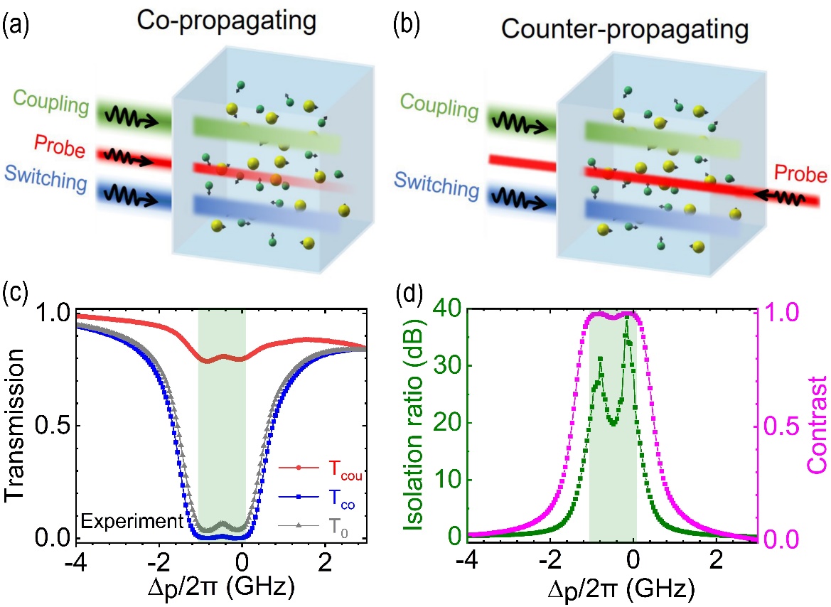 图1 实验设计和典型实验结果。(a)和(b)为实验设计图,(a)表示同向传输的情况,(b)表示反向传输的情况。(c)和(d)为典型实验结果,(c)画出了探测光的透过率谱,(d)是对应的隔离度和对比度。(c)和(d)中阴影部分表示隔离度大于20 dB的频率范围。