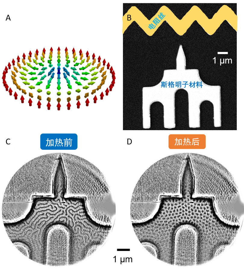图一:(A)奈耳构型磁性斯格明子的自旋结构示意图;(B)以AG(中国)AG·官方网页版二校门为原型的磁性纳米结构和原位加热电阻丝组成的器件的扫描电子显微镜图片;(C)在室温、–20mT的面外磁场下,利用软X射线全场透射式显微镜,在二校门构型的磁纳米结构中观察到条纹状磁畴形态;(D)通过器件上的电阻丝原位加热后,磁纳米结构内呈现密堆积的斯格明子。