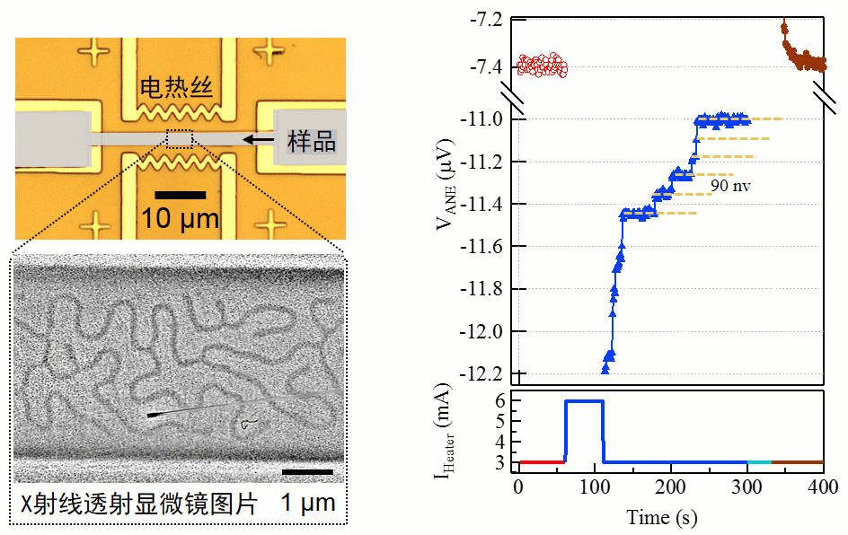 图二:(左上)实验器件照片及脉冲热流施加方法的示意;(左下)利用软X射线全场透射式显微镜对矩形磁纳米结构的成像结果。随着电阻丝中脉冲电压的增大,发热温度升高,更多的斯格明子可以通过从样品热端缺陷处和条纹畴的拓扑形变中产生,并伴随着向冷端单向扩散。(右)为随时间演化的反常能斯特测量结果,从中可以看到单个斯格明子的湮灭产生约90nV的反常能斯特电压信号。