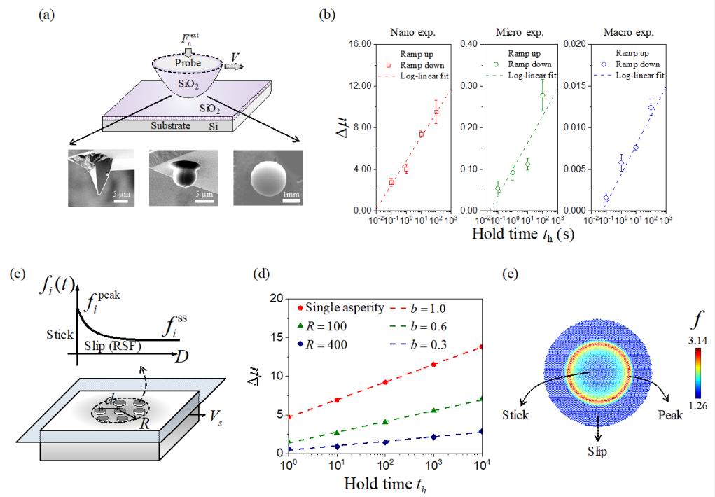 纳米、微米和毫米压头的摩擦演化实验。(a)摩擦演化实验示意图。图中下方从左到右依次为纳米、微米和毫米压头的形貌。(b)三个尺度下摩擦演化系数随演化时间的变化关系曲线。(c)多粗糙峰接触摩擦演化模型的示意图。(d)摩擦演化系数随演化时间的理论模拟结果。(e)临界滑动时刻接触界面的切向力分布及微接触峰的滑动状态。