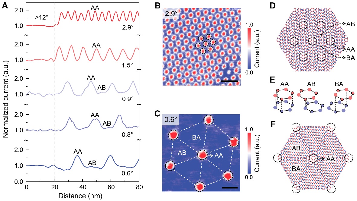图2. (A)不同扭转角度双层石墨烯表面获取的归一化电流曲线;(B)扭转角为2.9°样品表面的电流图像;(C) 扭转角为0.6°样品表面的电流图像;(D)-(F)对应的原子堆垛示意图