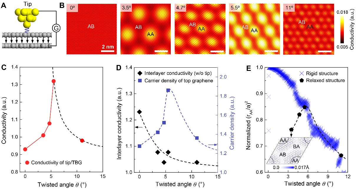 通过对石墨烯层间堆垛角度进行扭转是调控其物理(特别是电学)性能的有效手段。现有实验研究表明:随着石墨烯层间扭转角度的增大,石墨烯层间趋向于非公度堆垛而呈现出较弱的层间耦合;因此,一般来讲,石墨烯层间的电导将随着扭转角度的增大而单调降低。然而,最近的研究发现,当两层石墨烯以小扭转角度(小于1°)堆叠在一起时,在石墨烯层间范德华相互作用和石墨烯面内弹性变形能的竞争下,石墨烯会发生局部的原子级重构,形成局部的公度堆垛。这类小扭转角度堆垛的石墨烯往往展现出诸多奇特的物理行为,如强关联电子态、非常规超导和自发铁磁性等。目前,人们当前关注的焦点主要集中在小扭转角双层石墨烯面内方向的电学行为,而其层间电导率如何随扭曲角的改变而变化,尤其原子尺度重构对层间电导的影响,仍然是研究的热点和亟待回答的问题。