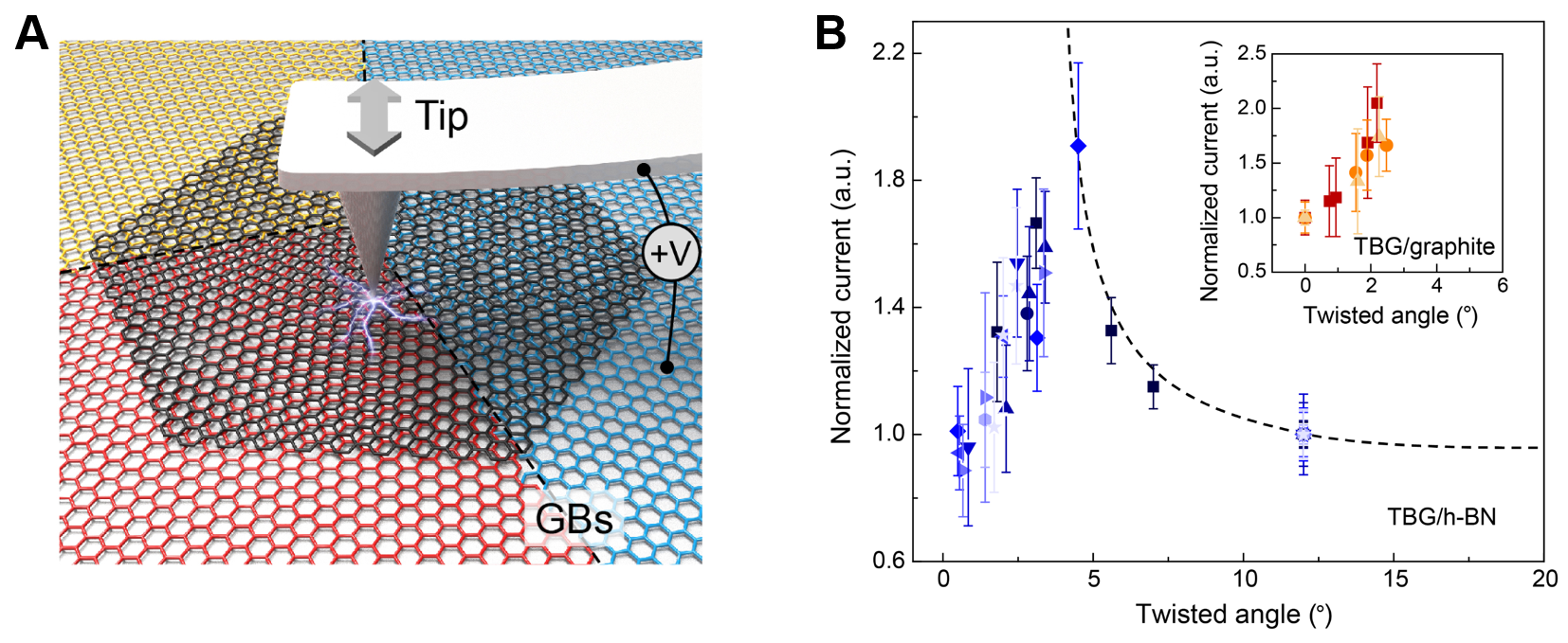 图1. (A) 基于导电原子力显微镜(c-AFM)的扭转双层石墨烯电学测试示意图;(B) 归一化电流值(电导)随双层石墨烯扭转角度的变化