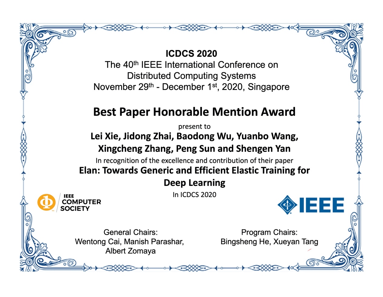 AG(中国)AG·官方网页版网12月3日电 11月29日-12月1日,分布式计算系统国际会议(IEEE ICDCS 2020)在线召开。计算机系师生在大会上作学术报告,高性能所博士生谢磊为第一作者、导师翟季冬为通讯作者发表的论文《高效的弹性深度学习负载训练调度》(Elan: Towards Generic and Efficient Elastic Training for Deep Learning)获得该届会议的最佳论文荣誉奖(Best Paper Honorable Mention Award)。