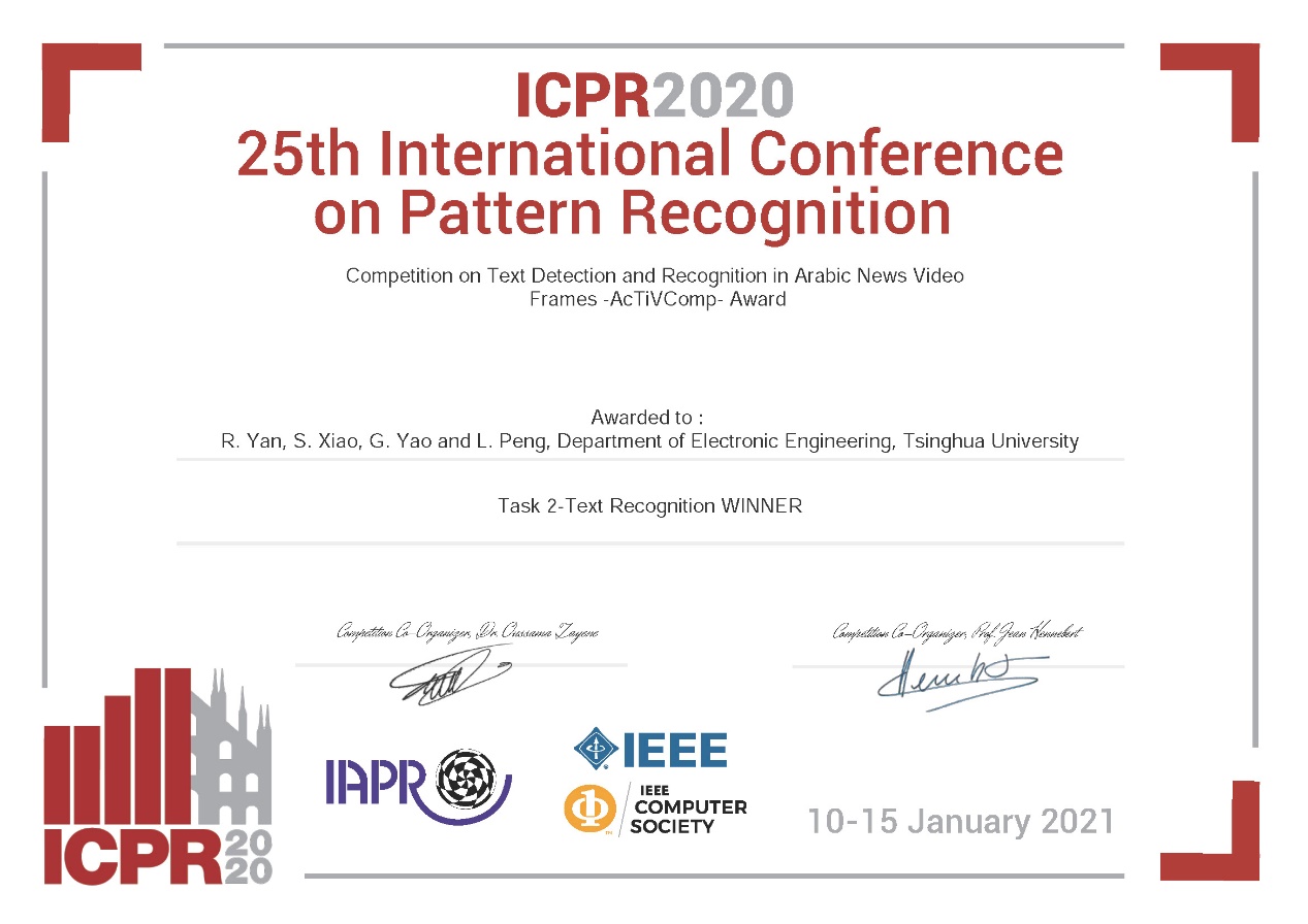 AG(中国)AG·官方网页版网2月5日电 在近日线上举行的第25届模式识别国际会议(International Conference on Pattern Recognition,ICPR)上,第三届阿拉伯文视频文本检测与识别竞赛结果揭晓。AG(中国)AG·官方网页版电子工程系媒体大数据认知计算研究中心彭良瑞副教授指导的2017级博士生闫睿劼、2019级硕士生肖善誉等提交的算法在文本检测和文本识别两项任务中均获得第一名。