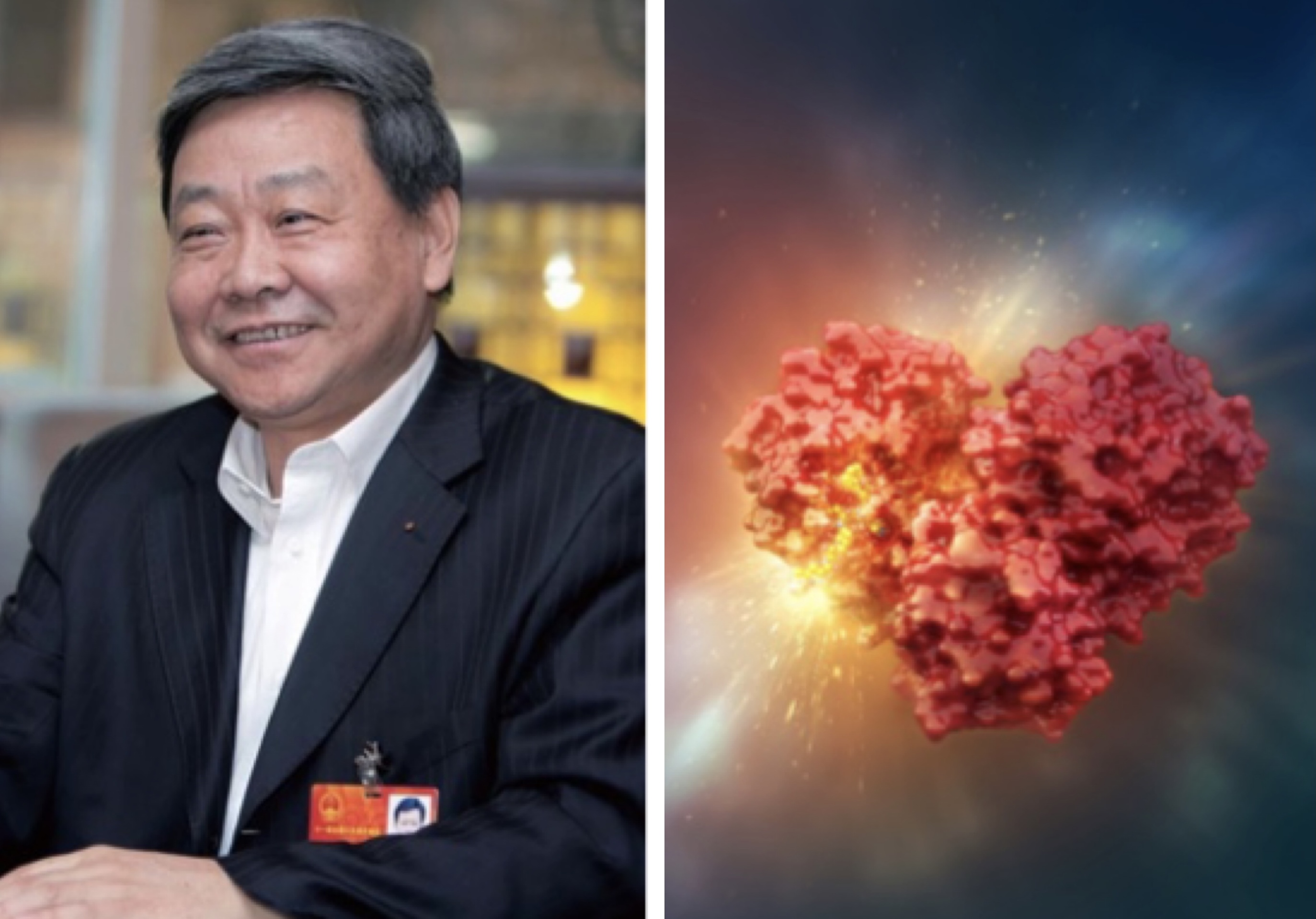 “首个新冠病毒蛋白质三维结构的解析及两个临床候选药物的发现”项目合作者饶子和院士与新冠病毒主蛋白酶(红色)与抑制剂(黄色)的复合物结构示意图