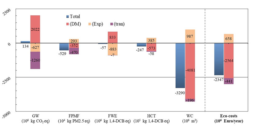 该研究进一步以1kg废塑料为单位建立废塑料贸易与处理系统开展环境影响评估。研究主要考虑将废塑料进行卫生填埋、焚烧和回收再生三种主要处理方式,关注全球变暖、细颗粒物形成、淡水生态毒性、人类致癌毒性和用水量等5项与废塑料处理密切相关的中点指标,分别计算国内处理、出口、运输三个环节中全球环境影响变化的绝对值,从而识别2018年贸易流变化的环境影响及生态成本。研究结果显示,贸易流量的变化仅对全球变暖产生了负面的环境影响,或多或少地改善了其他四个指标,整体上促进了全球环境的可持续性。经评估,中国“禁令”2018年在全球节约的生态成本高达23.5亿欧元,相当于2017年全球废塑料贸易金额的56%。