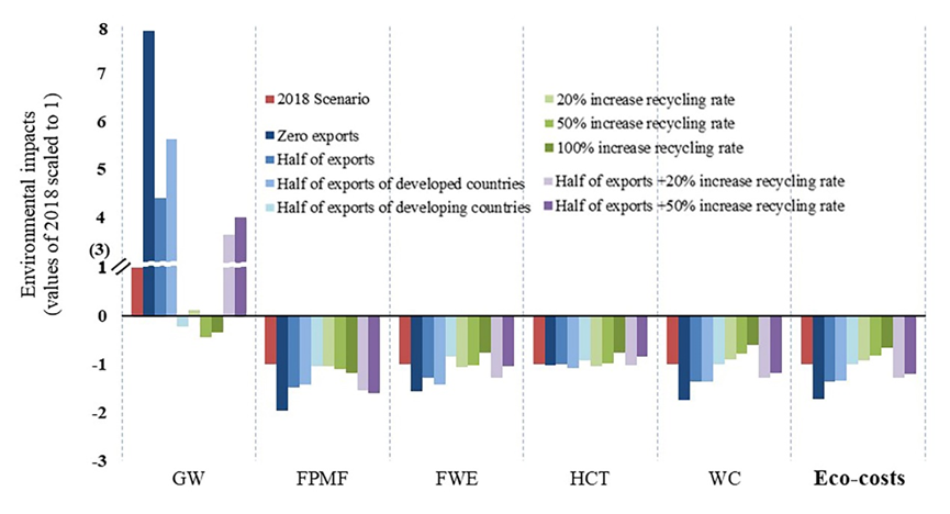 出口量降低、回收率上升情景及组合情景的环境影响比较
