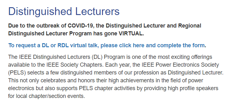 “杰出讲座学者计划”是IEEE整体遴选和支持的学术活动,具体由各个学会组织实施。IEEE PELS每年都会遴选出若干位在电力电子领域取得重要成就的专业人士作为杰出讲座学者,旨在通过讲座、研讨会等形式为遍布全球各地的PELS分会活动提供支持。