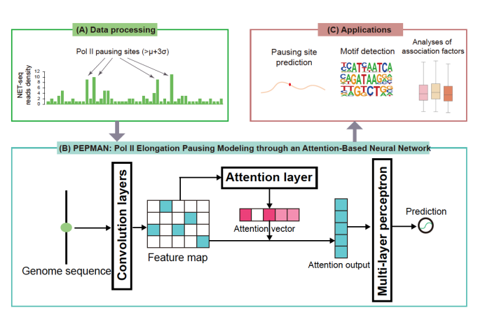 真核生物的转录是一个高度复杂且被准确调控的动态过程,RNA聚合酶II(RNA polymerase II, Pol II)作为转录过程(特别是转录延伸阶段)的核心分子成员,对遗传信息的传递起着关键作用。研究表明,在转录延伸过程中,普遍存在Pol II暂停(Pol II pausing)现象,其参与下游基因的表达调控、影响基因可变剪切的发生,与细胞分化、发育等生命活动息息相关。目前,Pol II暂停相关的转录调控机制研究主要依赖于NET-seq(Native elongating transcript sequencing)等高通量测序技术,成本高、需要一定实验周期。因此,如何实现在全基因组水平上快速、高效的分析Pol II暂停的偏好位点及其序列特征,以及其与相关转录因子间的关系,是转录调控领域亟待解决的技术难点。为了解决这一问题,来自AG(中国)AG·官方网页版的曾坚阳、赵诞团队采用基于注意力机制(attention mechanism)的卷积神经网络对全基因组上的Pol II暂停位点进行预测。在NET-seq数据集上,其预测准确率均显著优于现有机器学习模型。此外,研究组通过分析模型的注意力机制以及分析模型在基因组上特定位点的预测值,进一步探索了Pol II暂停的生物学特征以及和其他转录调控机制的关系,包括:发现了决定Pol II暂停的序列特征以及其与暂停位点的关系;通过分析不同可变剪切方式位点上Pol II的暂停倾向,提供了Pol II影响可变剪切的可能生物学机制;全面分析了Pol II与转录因子、组蛋白修饰、DNA甲基化发生的相关性;发现模型能够很好的弥补测序数据深度不足带来的缺陷。