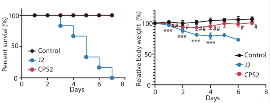 CPS2解决了CDK2抑制剂选择性的问题,对正常细胞(Beas2b、293T细胞系)的毒性较小,但CPS2可通过抑制肿瘤细胞增殖的方式产生抗肿瘤效果(图4)。作者也进行了在动物体内急毒实验,结果表明CPS2的安全性远高于其母核抑制剂J2(图5)。