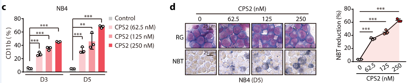 研究者将CPS2进一步应用于AML分化治疗中。在CPS2处理下,AML细胞的分化指标显著升高,细胞形态更成熟(图6)。同时,作者进行了多组Rescue实验,证明了CPS2通过引起细胞内CDK2的降解执行分化诱导功能。为充分论证CPS2作为CDK2选择性降解剂在AML临床治疗上的重要意义,研究者采集了多株AML病人原代细胞,并加入CPS2进行处理。结果表明,原代细胞在药物的处理下也可产生明显分化,充分证明了CPS2的潜在临床应用意义。