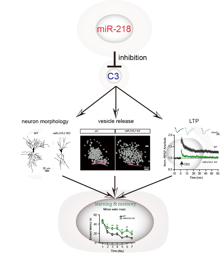 综上所述,miR-218-2基因在小鼠海马中通过靶基因C3调节神经元的形态和突触囊泡的转运与释放,进而影响神经元的突触可逆性和LTP的发生,最终影响小鼠的认知功能。该研究揭示了的神经退行性疾病和神经精神疾病可能通过共通的miR-218相关机制产生认知障碍,为后续的疾病认知缺陷的治疗提供了新的思路和方向。