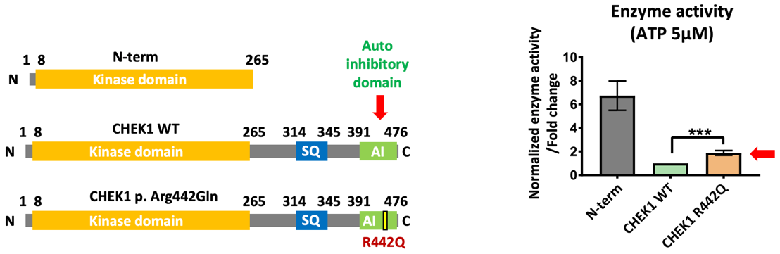 图4 CHEK1激酶结构及酶活。左图显示CHEK1蛋白的酶活结构域及自抑制区,右图显示p.R442Q突变的CHEK1激酶活性上升