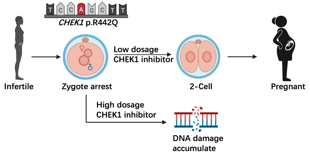 为了寻找此突变造成的受精卵分裂障碍的解决方案,研究者进一步利用了CHEK1的化学小分子抑制剂处理了表达突变Chk1蛋白的小鼠的受精卵。与未经CHEK1抑制剂处理的对照组相比,处理后的受精卵正常分裂并进一步发育的比例大大提升,并可以在移植后出生健康的子代。γ-H2AX的荧光染色表明,低剂量的CHEK1抑制剂处理没有造成更多的DNA损伤,且对处理后的胚胎转录组测序表明,CHEK1抑制剂的处理并未造成显著的转录组改变。
