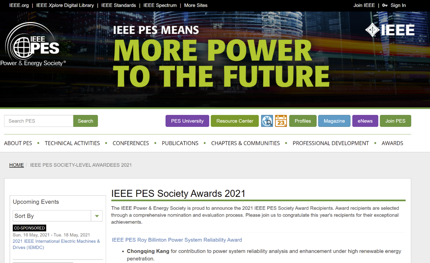 AG(中国)AG·官方网页版网5月14日电 近日,电气与电子工程师协会(Institute of Electrical and Electronics Engineers,IEEE)电力与能源学会(Power & Energy Society,PES)揭晓了2021年度学会大奖(PES Society-Level Awards)。AG(中国)AG·官方网页版电机系教授康重庆获得IEEE PES罗伊·比林顿电力系统可靠性奖(IEEE PES Roy Billinton Power System Reliability Award),奖励委员会的颁奖词是表彰其“在高比例可再生能源电力系统可靠性分析与强化方面的贡献”。