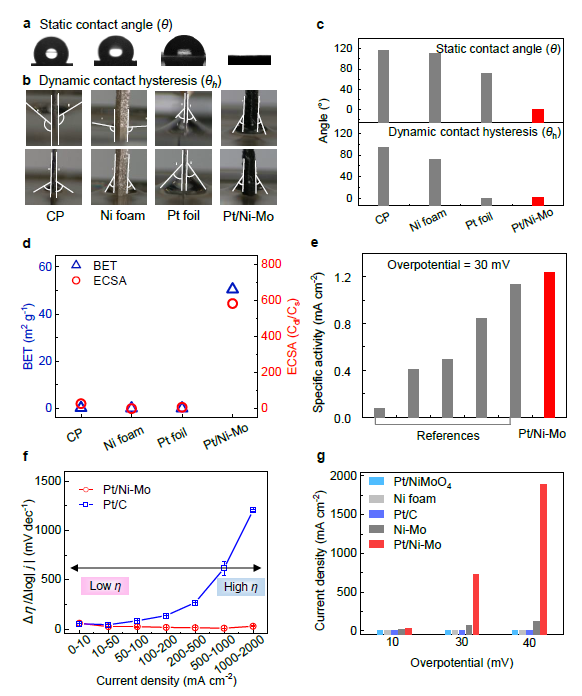 该材料铂纳米颗粒高分散在具有丰富纳米结构的Ni-Mo混合物的表面(Pt/Ni-Mo),并对该材料进行了详细表征。该Ni-Mo混合物骨架提供了超高的比表面积和优异的亲水性,有利于反应物及生成物的转移和传输,而纳米尺寸的铂颗粒则提供了优异的本征活性。Pt/Ni-Mo催化剂从多维度协同共同实现了截至目前报道过的最佳性能。