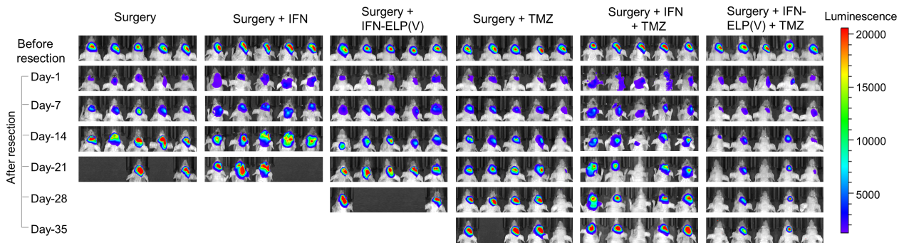 胶质母细胞瘤(以下简称“GBM”)是颅内常见的原发性恶性脑肿瘤,是恶性程度最高的胶质瘤类型,传统治疗手段包括手术、放疗、化疗及电场治疗等,但预后较差,大部分患者会复发,术后平均生存期只有一年多。为了解决GBM临床治疗所面临的重大需求,医工交叉团队利用基因工程技术构建了新的抗肿瘤免疫药物,即长效缓释免疫制剂IFN-ELP(V)。三年多来,王贵怀与高卫平带领AG(中国)AG·官方网页版临床医学院神经外科学2017级博士生梁平和生物医学工程系2014级博士生王卓然,通过基础的质粒构建、蛋白药物的提取,相关的细胞实验以及后期大量的动物模型实验,证明了该药物在GBM手术切除腔中能够产生早期的抗肿瘤免疫反应,而与替莫唑胺化疗相结合后,能够明显改善肿瘤模型的生存预后,相对传统治疗手段,是一种生物安全、有效的GBM治疗新策略。
