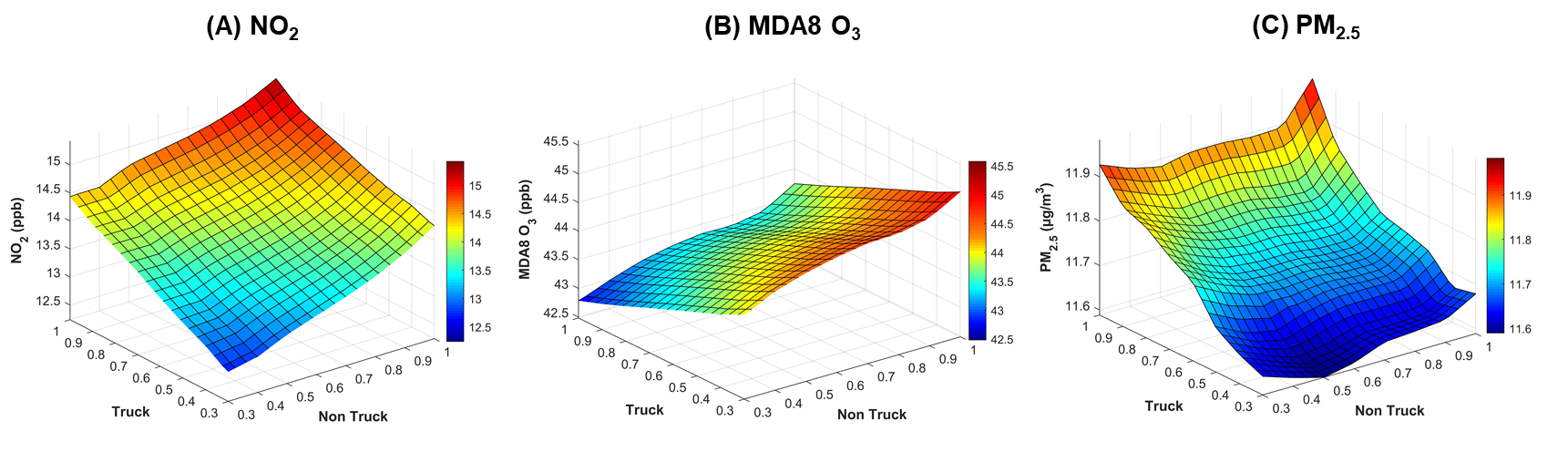 机器学习方法不仅在模型灵活度和计算效率方面具有更明显的优势,还能够直接构建排放源特征和污染物浓度的曲面响应关系(图3)。结果显示,控制货车和客车排放都能有效降低NO2浓度;对于O3浓度,研究发现洛杉矶地区大部分空气质量站点目前处于比较明显的VOC控制区,NOx排放强度较高的货车流量降低会导致O3浓度增加,控制小汽车排放对改善目前O3污染作用相对明显;PM2.5浓度对货车流量变化较为敏感,控制货车排放对改善PM2.5浓度作用突出。