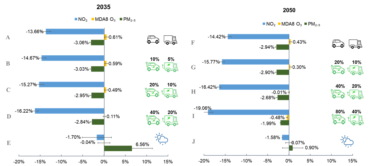 图4 2035及2050年不同交通情景下NO2、MDA8 O3、PM2.5浓度相对于2019年的下降率。(A-E)和(F-J)分别为基准交通排放情景(不考虑额外电动化政策)、3种电动化情景(非货车和货车电动化比例见右侧图片)和未来气候变化情景。