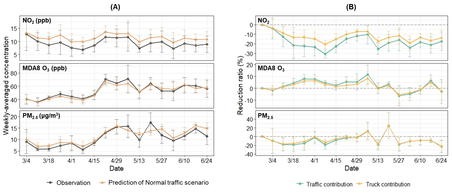 图2 疫情期间污染物浓度实际观测值与无疫情情景预测值的对比(A)及整体交通和货车车队对污染物浓度削减的贡献(B)