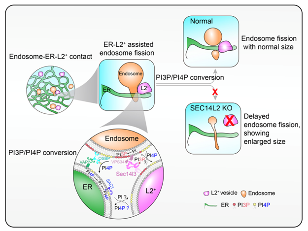 图2.高尔基体分泌的SEC14L2小泡与内质网协同调控内吞体分裂的模式图。SEC14L2小泡通过与内质网和内吞体之间形成膜相互作用,促进内吞体上PtdIns4P向PtdIns3P转换,从而促进内吞体分裂。